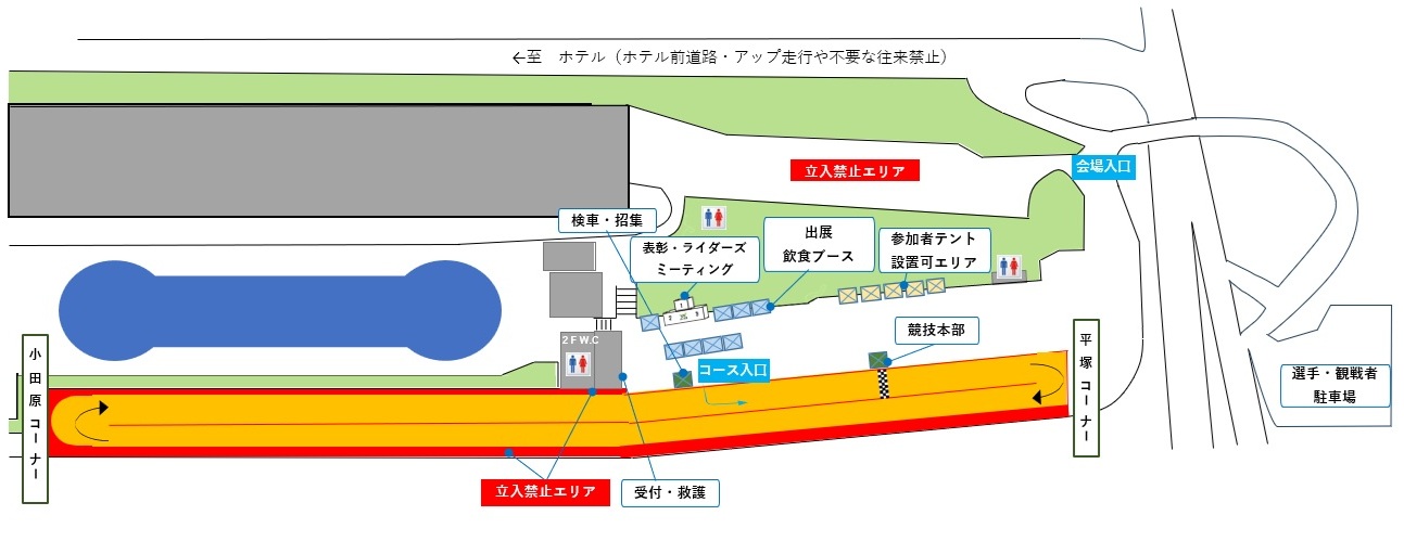 - 受付の建物より先、小田原方面(上図立入禁止エリア)への一般参加者の立ち入りはできません。