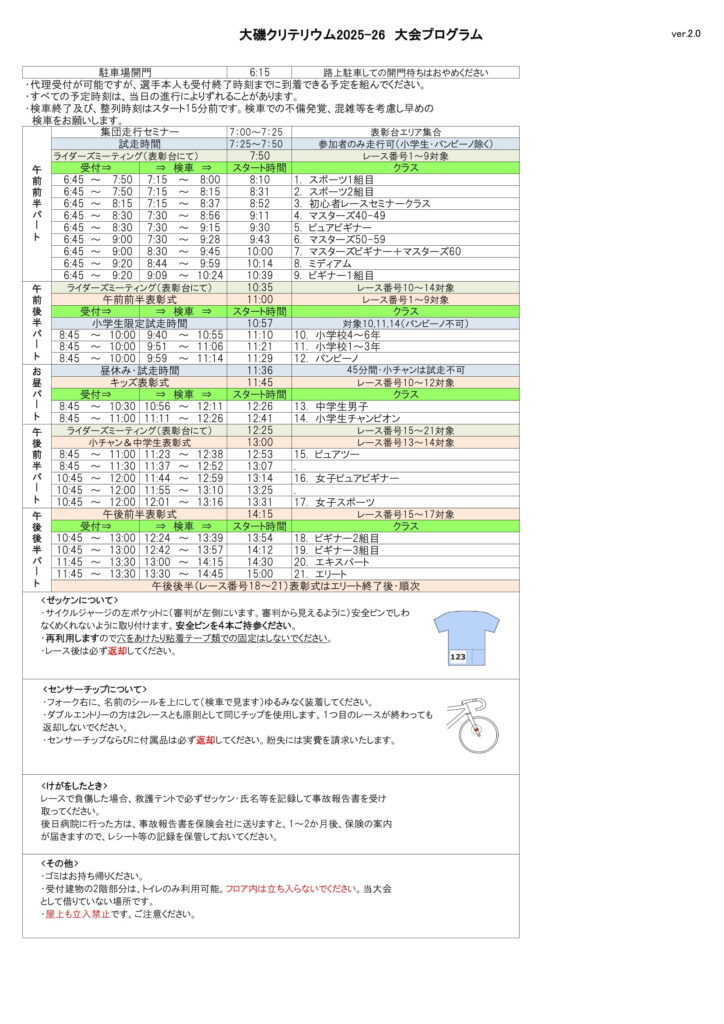 必ず最新のタイムテーブルを確認するようにお願いいたします。 - 参加者の方は必ずライダーズミーティングにご参加ください。