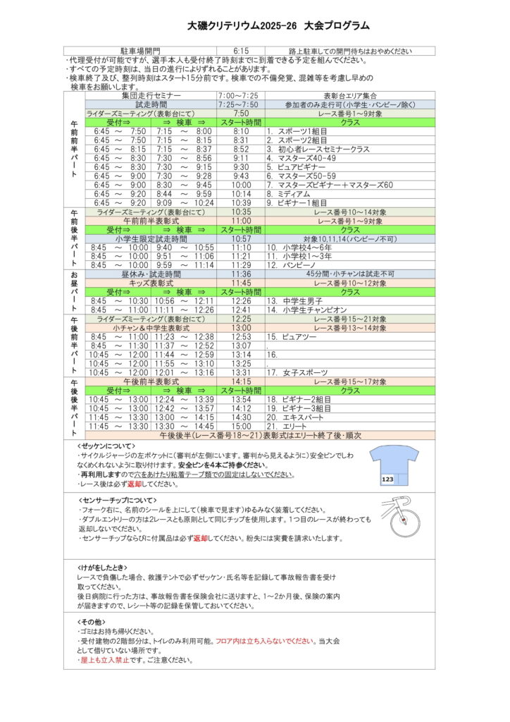 必ず最新のタイムテーブルを確認するようにお願いいたします。 - 参加者の方は必ずライダーズミーティングにご参加ください。